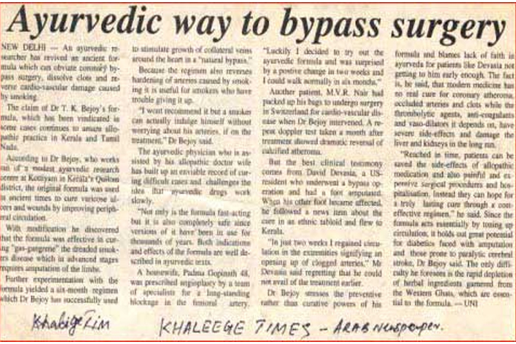 Raj matha Vijaya Raja Sindhya, Former Vice President of the Bharathiya Janta Party (BJP) at Kottiyam take treatment at Bejoy's Ayurvedic Research Centre (News on Mathrubhumi Malayalam Daily)